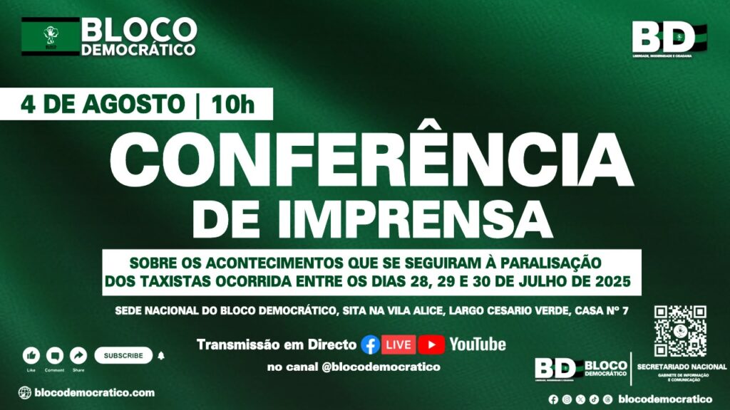 O Bloco Democrático realiza uma 𝐂𝐨𝐧𝐟𝐞𝐫𝐞̂𝐧𝐜𝐢𝐚 𝐝𝐞 𝐈𝐦𝐩𝐫𝐞𝐧𝐬𝐚 no dia 𝟒 𝐝𝐞 𝐀𝐠𝐨𝐬𝐭𝐨, 𝐚̀𝐬 𝟏𝟎𝐡, para abordar de forma clara, firme e comprometida 𝐨𝐬 𝐚𝐜𝐨𝐧𝐭𝐞𝐜𝐢𝐦𝐞𝐧𝐭𝐨𝐬 𝐪𝐮𝐞 𝐬𝐞 𝐬𝐞𝐠𝐮𝐢𝐫𝐚𝐦 𝐚̀ 𝐩𝐚𝐫𝐚𝐥𝐢𝐬𝐚𝐜̧𝐚̃𝐨 𝐝𝐨𝐬 𝐭𝐚𝐱𝐢𝐬𝐭𝐚𝐬 𝐨𝐜𝐨𝐫𝐫𝐢𝐝𝐚 𝐧𝐨𝐬 𝐝𝐢𝐚𝐬 𝟐𝟖, 𝟐𝟗 𝐞 𝟑𝟎 𝐝𝐞 𝐉𝐮𝐥𝐡𝐨 𝐝𝐞 𝟐𝟎𝟐𝟓.