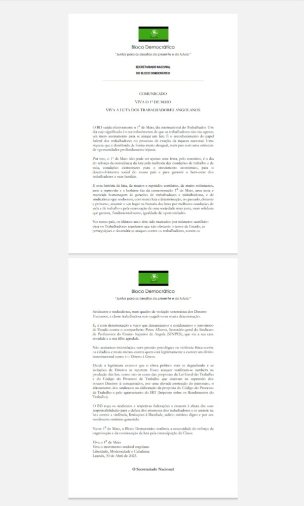 Apôs o feriado do 1⁰ de Maio, dia internacional do Trabalhador, saudado efusivamente pelo Secretariado Nacional do Bloco Democrático, um dia cujo significado é o reconhecimento de que os trabalhadores não são apenas um mero instrumento para se atingir um fim. Falando de uma riqueza que é distribuída de forma muito desigual, num pais com uma estrutura de oportunidades profundamente injusta. A mensagem desse 1º de Maio não poderia apenas passar como uma data festiva, pelo contrário, deve ser tida como o dia do reforço da consciência da luta pela melhoria das condições de trabalho e de vida, condições elementares para o crescimento económico, para o desenvolvimento social do nosso país e para garantir o bem-estar dos trabalhadores e suas famílias. E essa história de luta, de muitos e repetidos combates, de muito sofrimento, ante a repressão e a barbárie faz da comemoração 1⁰ de Maio, uma justa e merecida homenagem às gerações de trabalhadores e trabalhadoras, e de sindicalistas que souberam, com muita luta e determinação, no passado, distante e próximo, assumir o seu lugar na historia das lutas por melhores condições de vida e de trabalho e pela construção de uma sociedade mais justa, mais solidaria que garanta, fundamentalmente, igualdade de oportunidades. No nosso país, os últimos anos têm sido marcados por inúmeros sacrifícios para os Trabalhadores angolanos que não obstante o terror de Estado, as perseguições e sistemáticos ataques contra os trabalhadores, contra o Bloco Democrático “Juntos para os desafios do presente e do futuro.” Sindicatos e sindicalistas, num quadro de violação sistemática dos Direitos Humanos, a classe trabalhadora tem reagido com muita determinação. E, é com determinação e vigor que foi denunciado e condenado o terrorismo de Estado contra o companheiro Peres Alberto, Secretário-geral do Sindicato de Professores do Ensino Superior de Angola (SINPES), que viu a sua casa invadida e a sua filha agredida. Não sendo aceite nenhum tipo de intimidação, nem pressão psicológica ou violência física contra os cidadãos e muito menos contra quem está legitimamente a exercer um direito constitucional como é o Direito à Greve. Desde a legislatura anterior que o clima político vem se degradando e as violações de Direitos se repetem. Esses ataques verificam-se também na produção das leis, como são os casos das propostas da Lei Geral do Trabalho e do Código do Processo de Trabalho que insistem na supressão dos poucos Direitos já conquistados, por uma elevada proteção do patronato, o afastamento dos sindicatos na elaboração da proposta do Código do Processo de Trabalho e pelo agravamento do IRT (Imposto sobre os Rendimentos do Trabalho). O BD continua nesse âmbito, rogando os sindicatos e respetivas federações a estarem à altura das suas responsabilidades para a defesa dos interesses dos trabalhadores e se unirem na luta contra a violência, limitações à liberdade, salário mínimo digno e por um rendimento mínimo garantido. Lembrando a mensagem do 1⁰ de Maio, o Bloco Democrático reafirma a necessidade do reforço da organização e da continuação da luta pela emancipação da Classe.