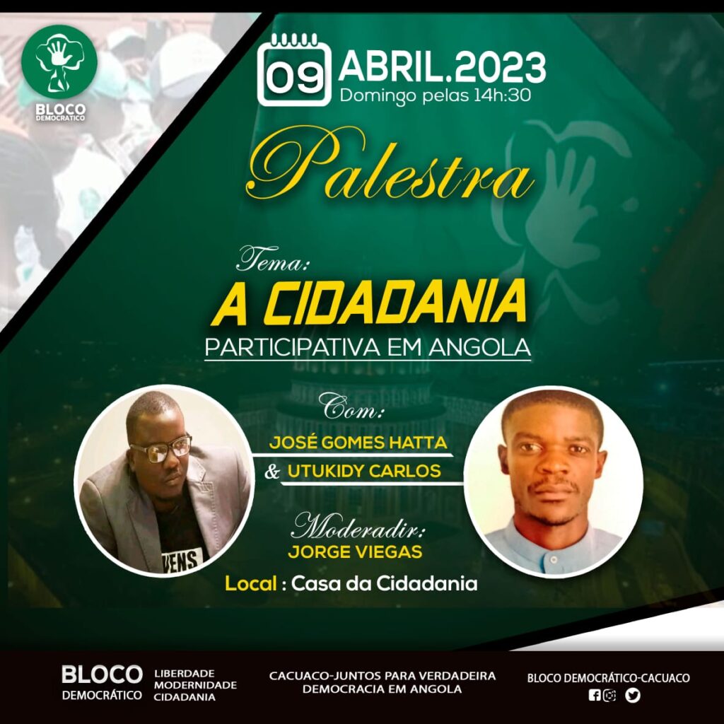 Na base dos problemas dos angolanos, o Secretariado Municipal de Cacuaco do BD, congregará jovens na casa da cidadania deste município, (defronte o ex. colégio Wassuca), no dia 09 de Abril (Domingo) pelas 14h30 numa atividade em torno do tema “A CIDADANIA PARTICIPATIVA EM ANGOLA”